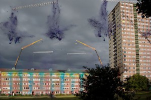 7:14pm This final shot for tonight shows the base of the narrow end of the high-rise block. That big red splat must have been fired off earlier today – I’ll bet it would have been impressive.