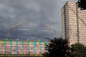 6:11pm After being disappointed with my position yesterday, I started off here. This looked as if it would give me a good position to see the action. Fortunately, they haven’t set of the big effect of “painting” the high-rise block yet. And look! Many more buckets have been added to the main face – if you recall, there was only a solitary bucket in the top right corner yesterday afternoon.