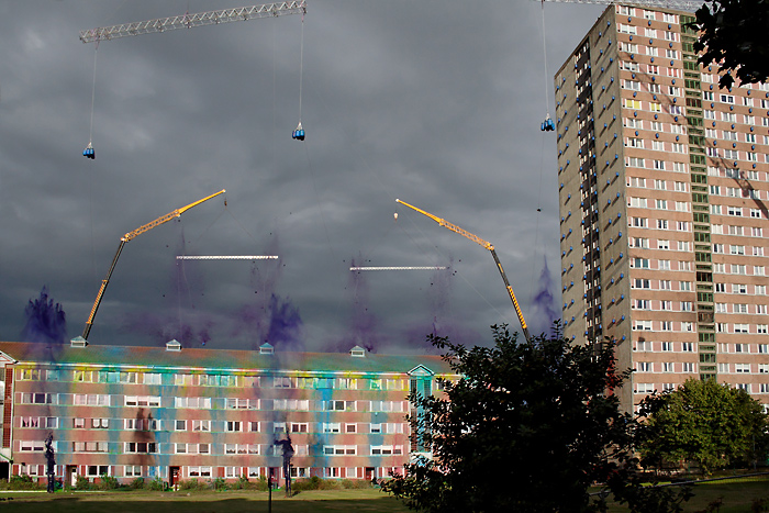 Purple paint, exploding up from the ground