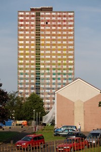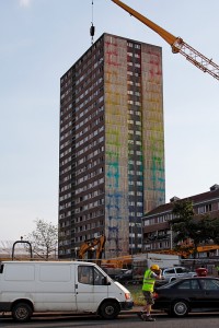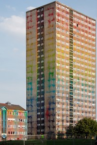 I managed to leave work an hour earlier today, and did the usual rush-home-grab-camera-gear-jump-in-car-and-rush-over routine. But as I turned the corner which brought the high-rise into view in the distance, my heart sank – I could see that the high-rise was now painted in rainbow colours. 🙁